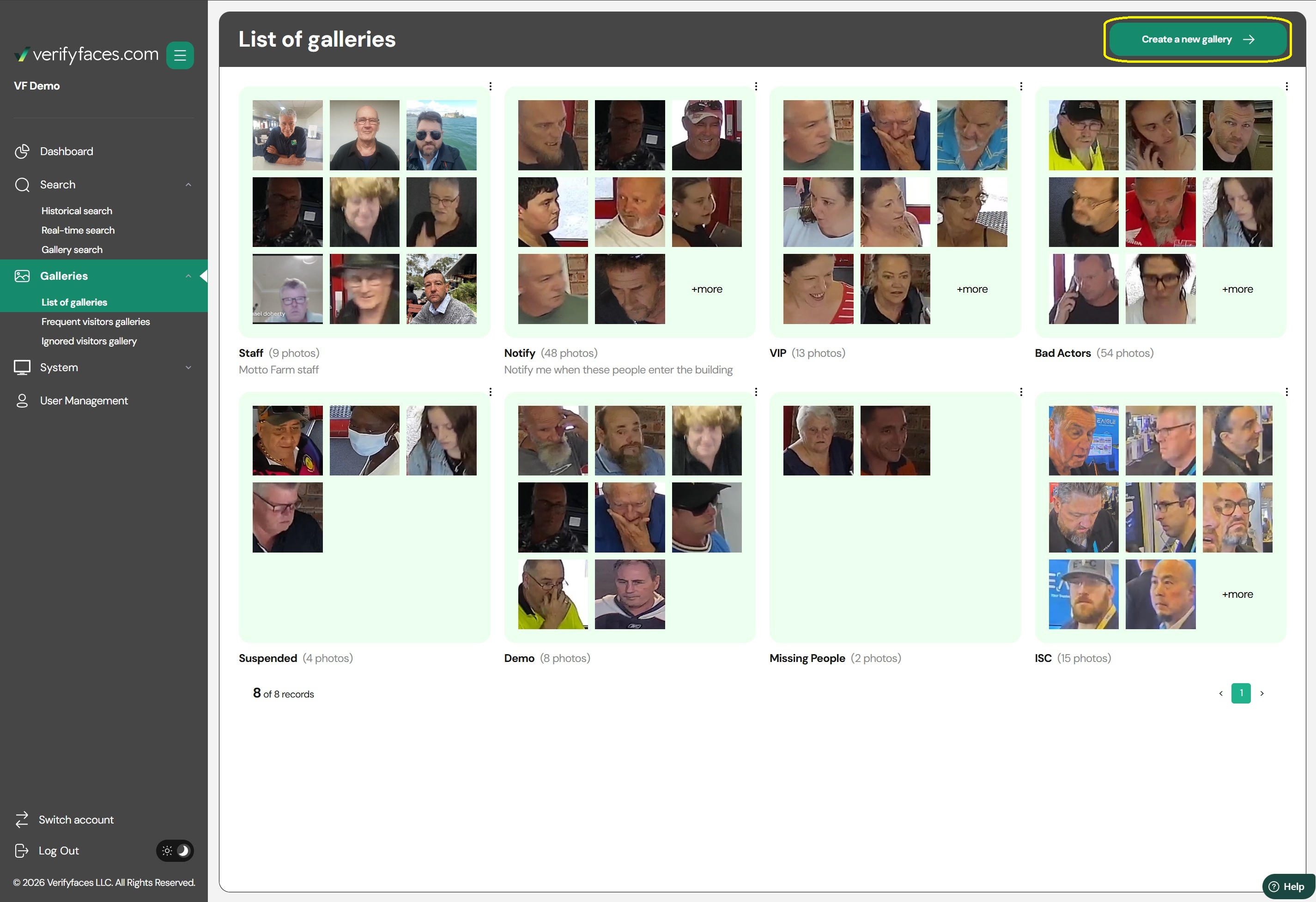 Galleries in Verifyfaces are custom collections of facial matching data, tailored to meet specific monitoring needs. Proper management of these galleries is essential for maximizing the efficiency and effectiveness of the Verifyfaces system.