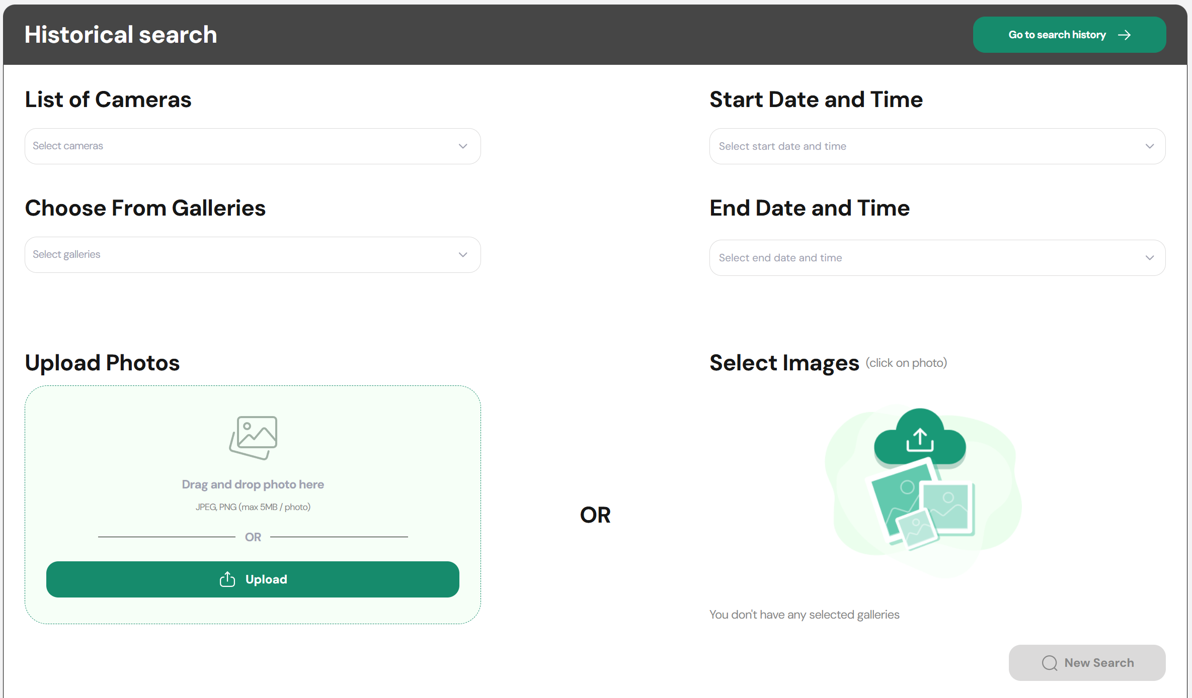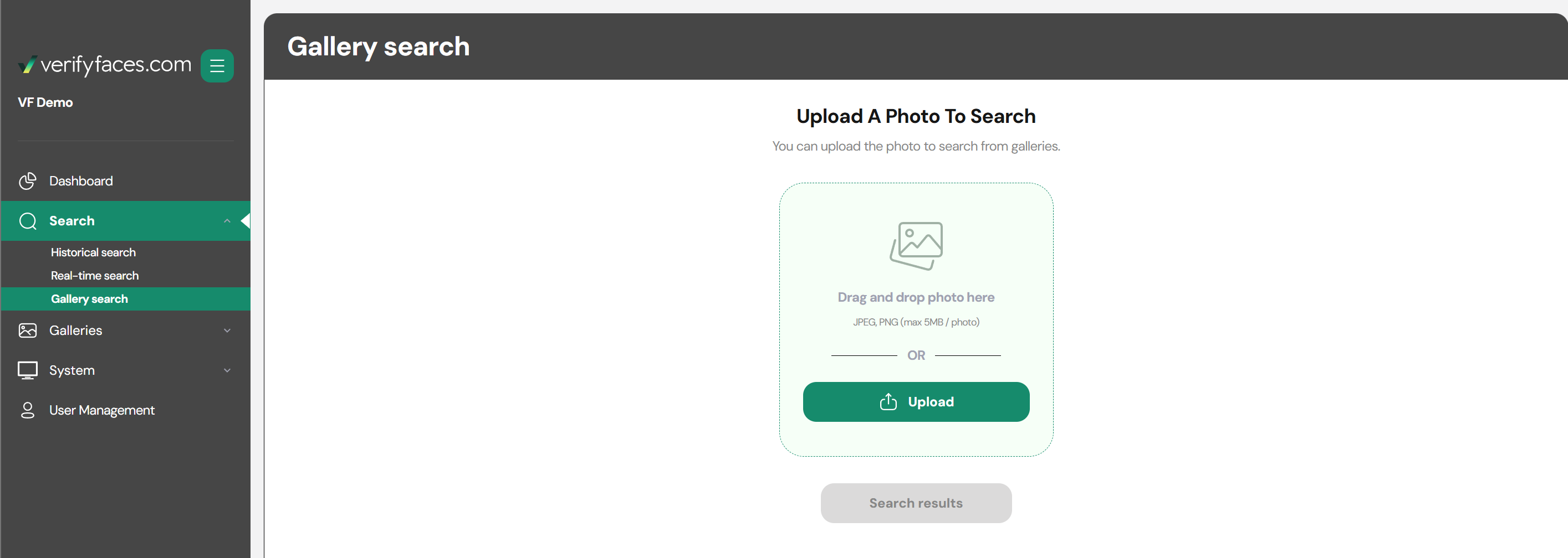 - Gallery Search: This feature allows you to upload a photo to determine which gallery or galleries a person belongs to. This tool helps you quickly identify where a person is categorized and ensures your galleries are used effectively for verification and monitoring.