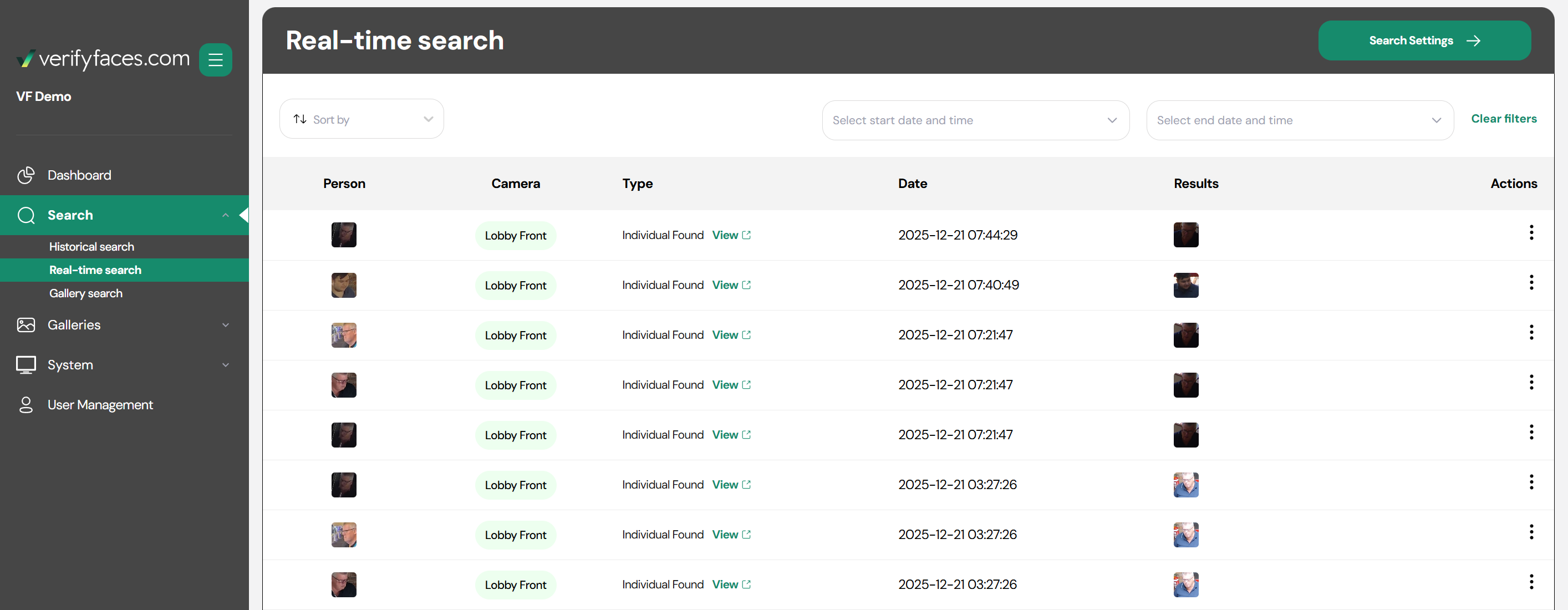 - Real-time Search: This feature acts as a live event viewer, displaying matches against your galleries as they occur. The system continuously monitors for individuals of interest, and when a match is made, it appears here in real time. You can customize which matches appear, choosing to view all matching events or only matches from specific galleries. To reduce redundant notifications, there is a 15-minute timeout after a match for any individual, meaning a new event for the same person will not appear until after this period. Real-Time Searches allow you to quickly identify and respond to individuals as they are detected.