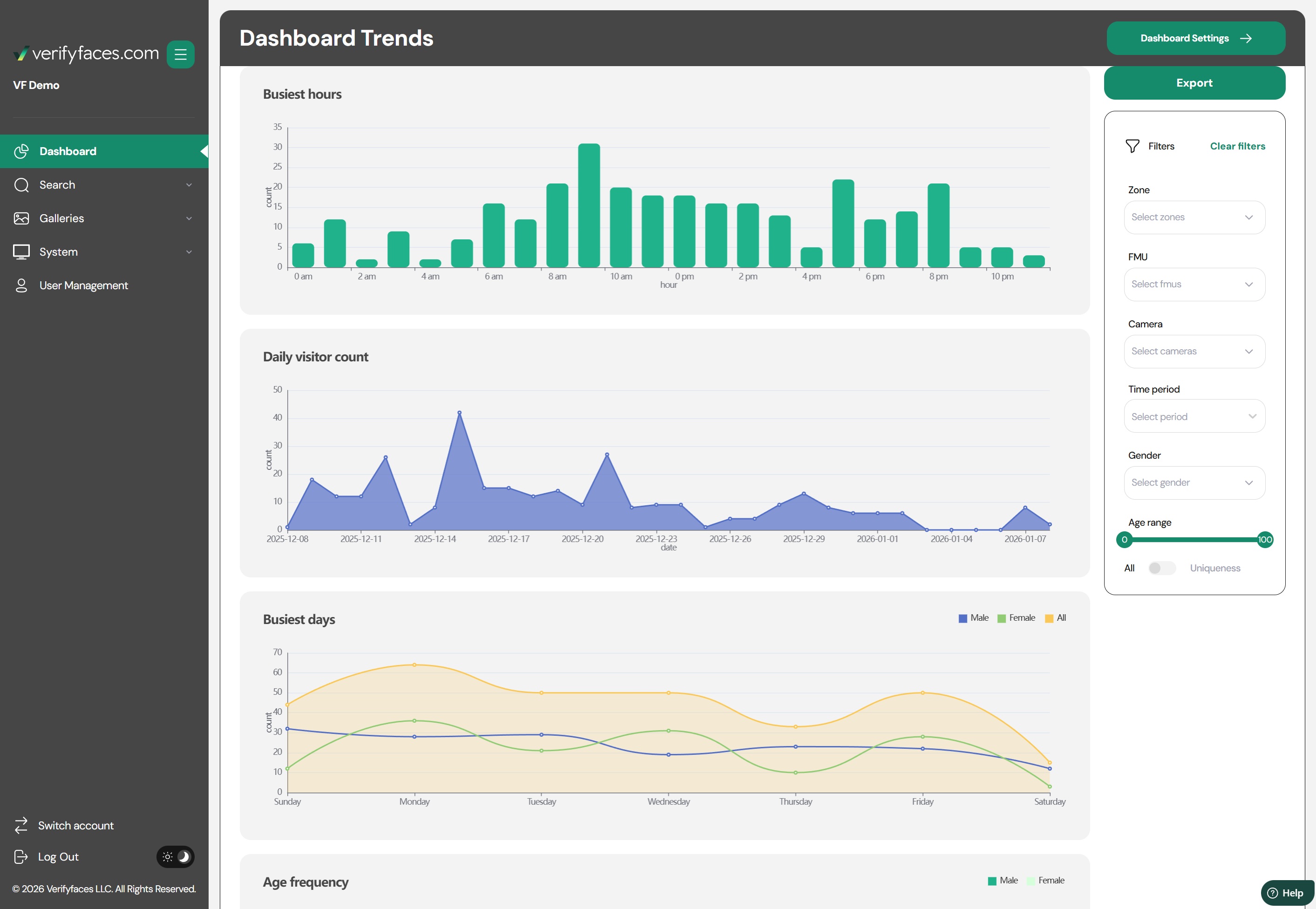 The main interface of Verifyfaces allows users to view real-time data, analytics, and system notifications. This includes insights such as gender, age groups, combined age and gender metrics, daily visitor counts, busiest hours, busiest days, zone activity, and camera ratios. The dashboard displays visual graphs and real-time data for your Verifyfaces system.