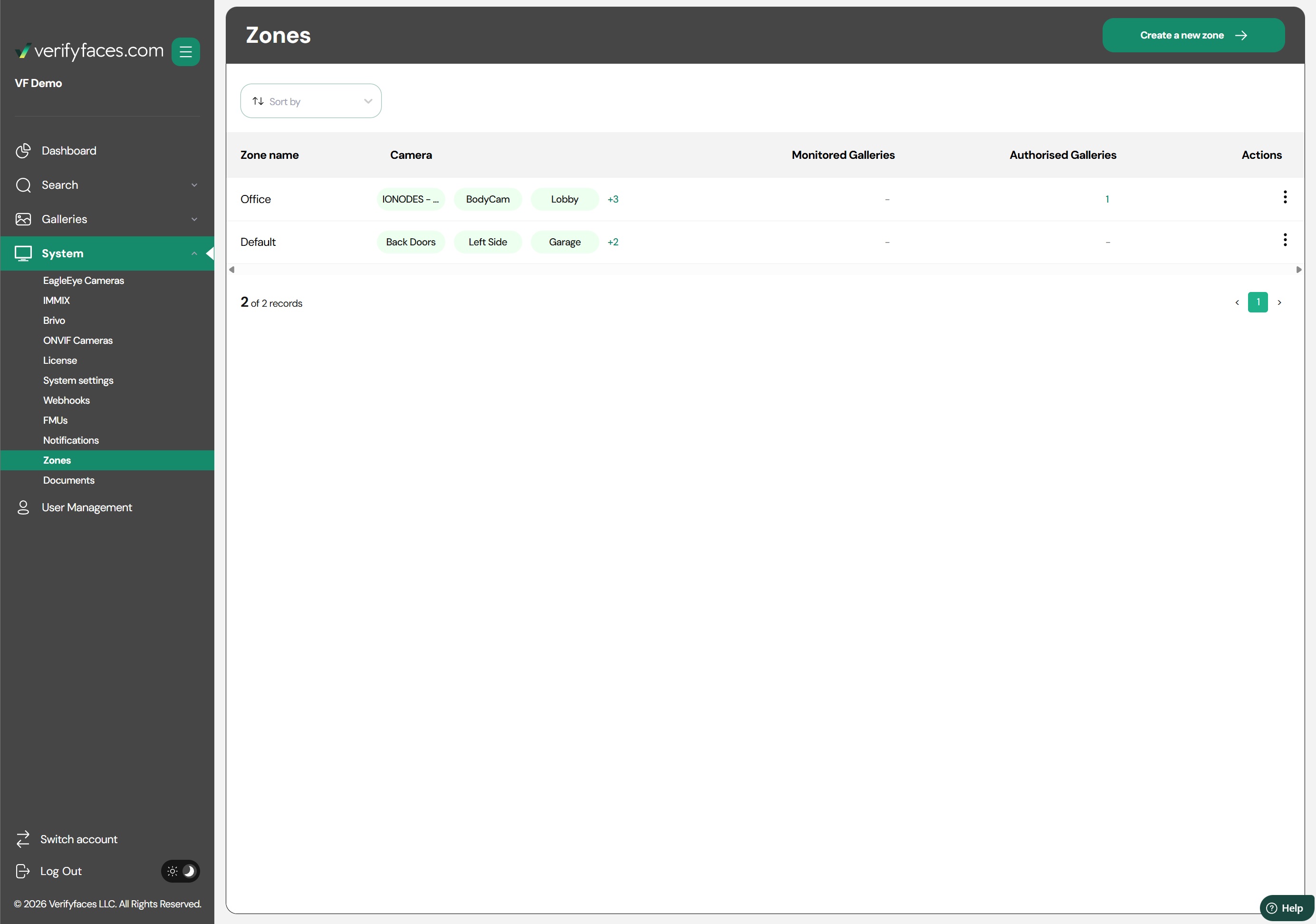 Zones in Verifyfaces allow you to create custom areas within your premises by grouping cameras and defining specific monitoring rules for each area. By designating zones, you can tailor which galleries are authorized or unauthorized in particular areas, control access, and monitor activity more efficiently.